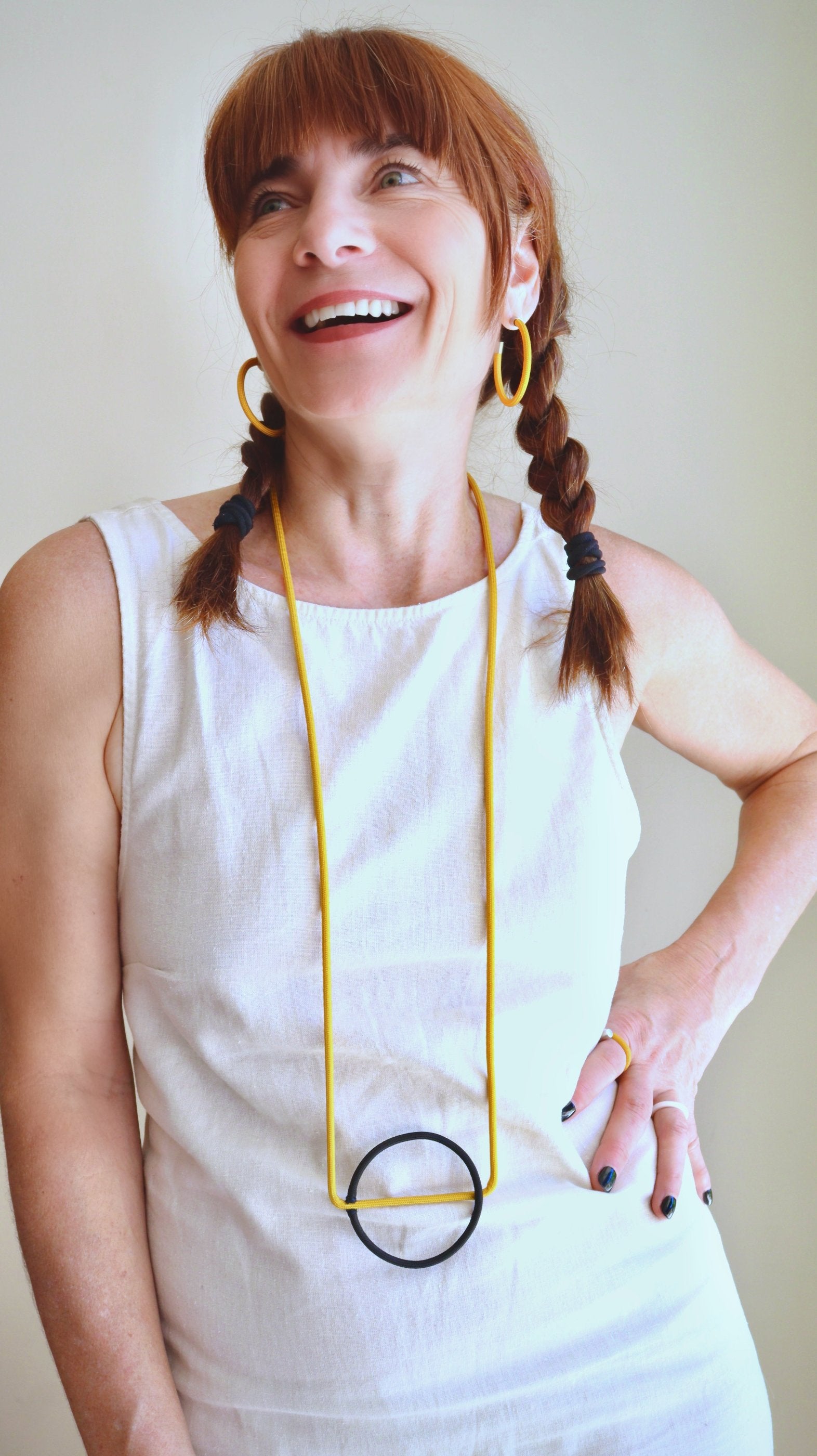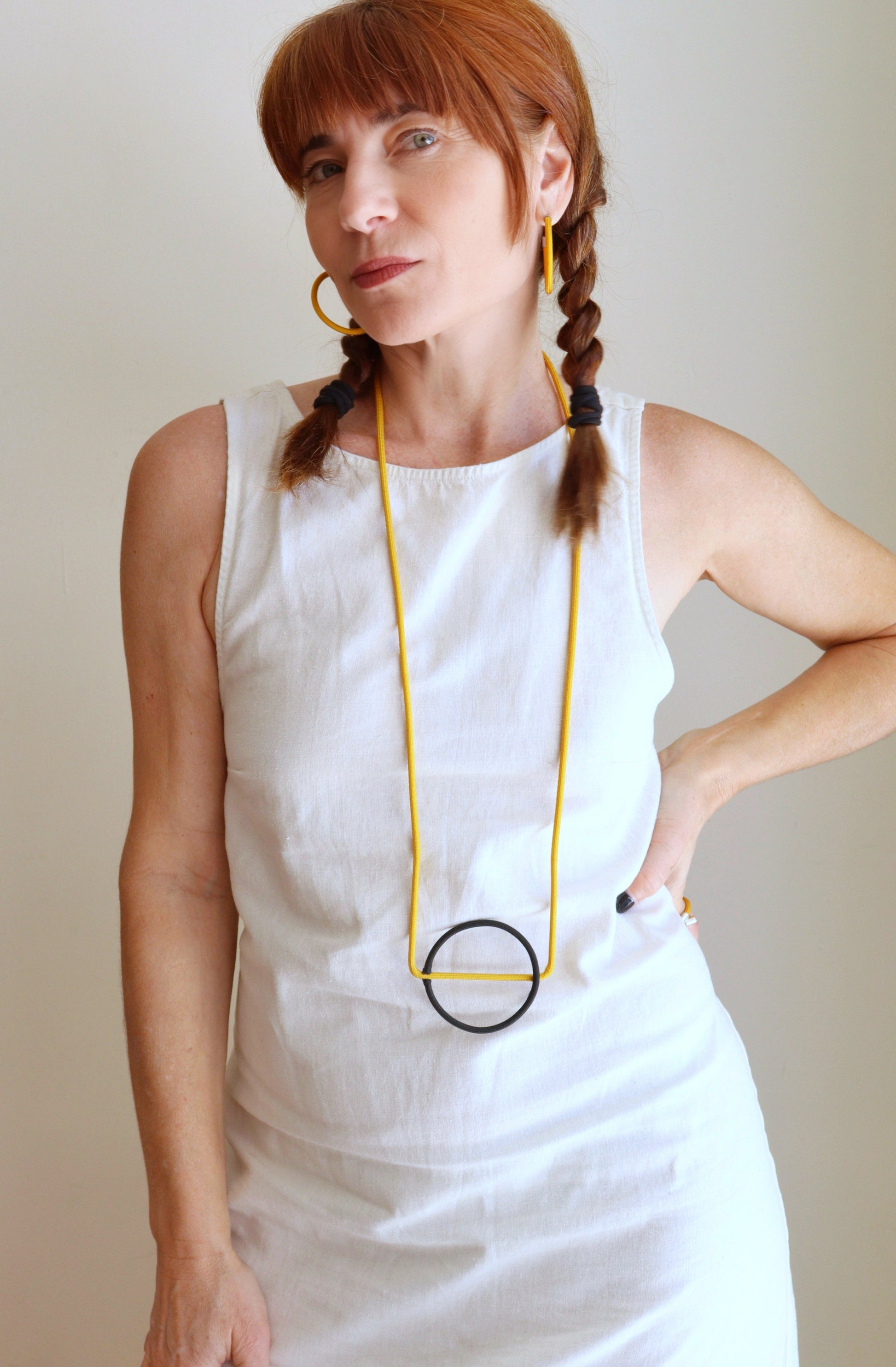 The LINEA collection designed by Joelle Benvenuto is a colorful, modern, and minimalist line of necklaces, earrings, rings, bracelets, and pins.