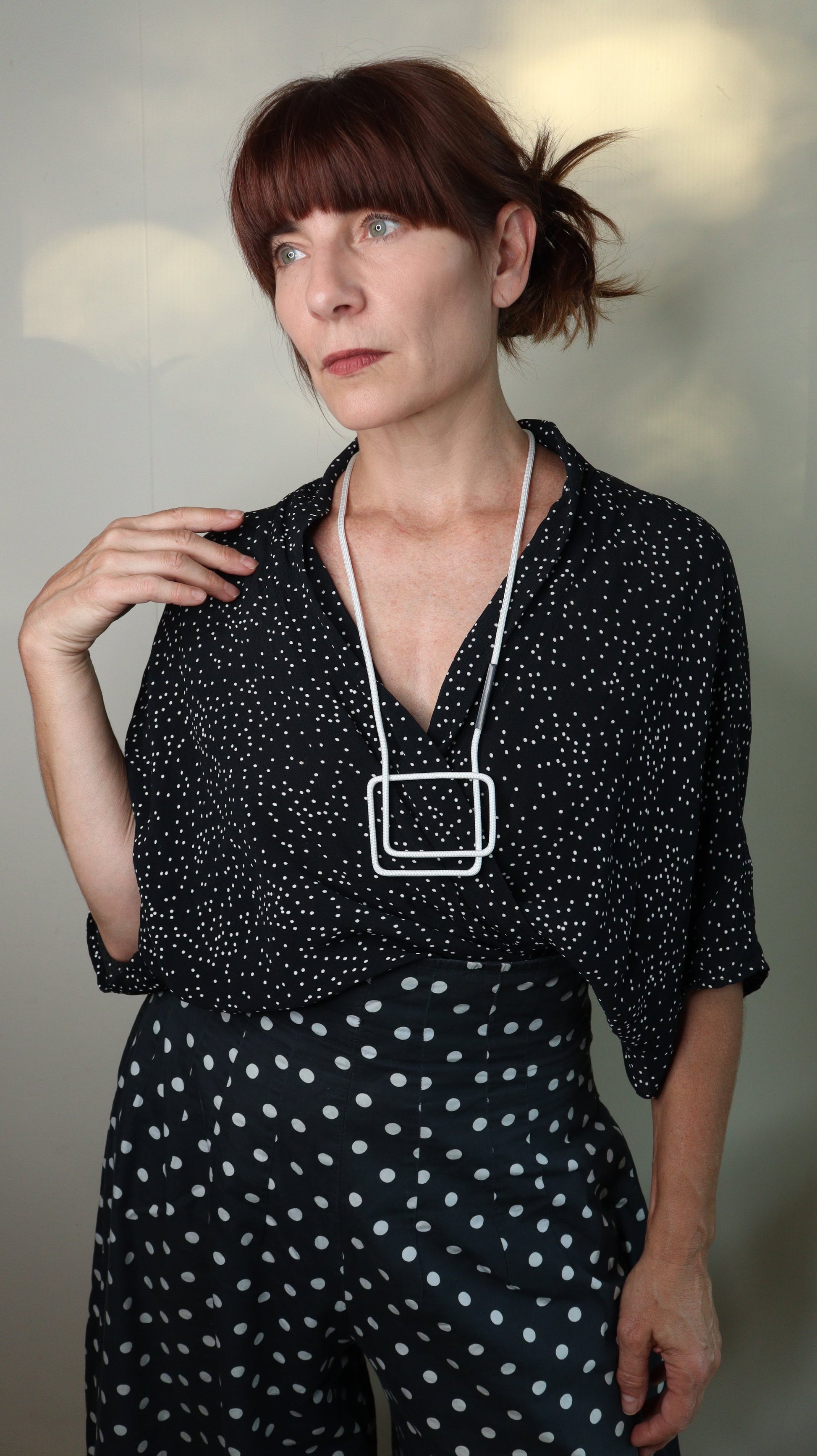 This monochrome necklace can be contrasted with three different finishes: a black finish that complements light colors, a silver finish that pairs well with cool colors, and a gold finish that enhances warm colors.